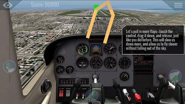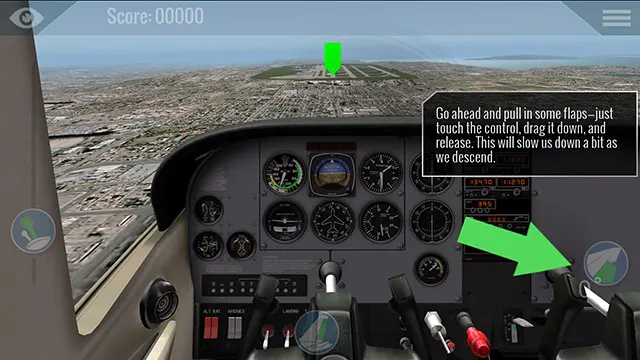 今度は、フラップを下げろと指示が。右のフラップアイコンを下にドラッグします。0度、10度、20度、30度の段階があるようです。滑走路が近づくに従って、少しずつ下げて行きます。