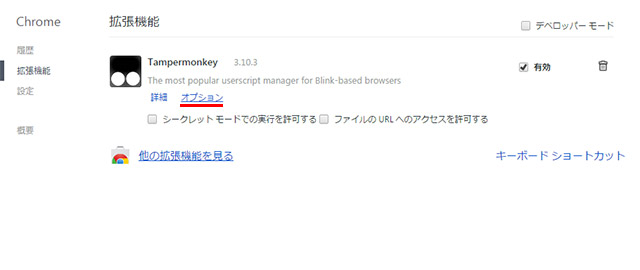 拡張機能から、Tampermonkey の オプションを開く。