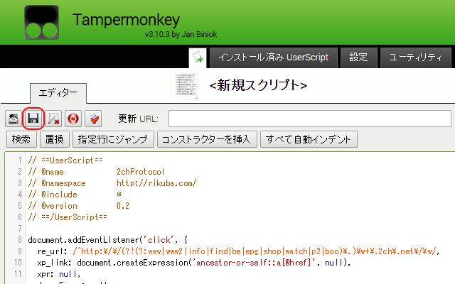 スクリプトアイコンのタブを開き、エディターへrikubaさんのサイトの jsファイル のテキストを貼り付ける。 (エディターに最初から書かれているサンプルは消去して上書きする)