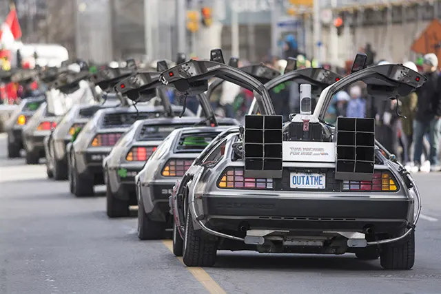 実は3/17にカナダ・トロントの「聖パトリック祭」で行われたパレードの一幕。聖パトリックの出身地がアイルランドなのと、デロリアンの製造工場が北アイルランドにあったことに繋げて、デロリアンが行進したそうです。ほとんどは通常のデロリアンで、列の最後の1台がBTTF仕様ですね。
