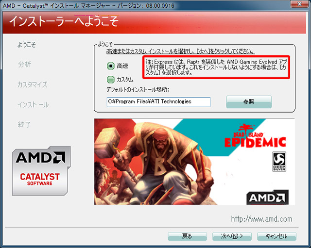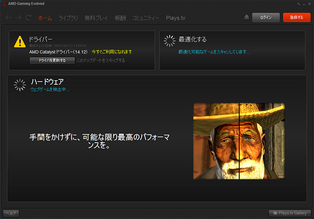 PCを起動すると、こんな画面が開いた。なに?AMD GAMING EVOLVED?そして、PCのファンがフォーンと頑張ってる。