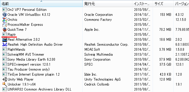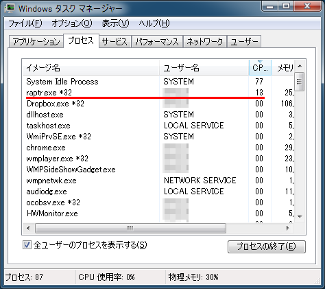 raptr.exeってのがCPUを13食ってる… AMD GAMING EVOLVEDを閉じても変わらず食い続けの状態。調べてみたら、これはAMDのゲームプレイ環境用ツールで、常駐して負荷をかけ続けることもあるとか。正にその状態じゃないか。アンインストールしてしまおう。