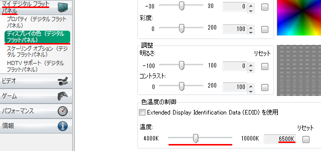 デスクトップ画面を右クリック → AMD Catalyst Control Center → マイデジタル フラットパネル → ディスプレイの色 (デジタルフラットパネル) → 色温度の制御 でスライダーを動かして 6400Kから6500Kにしてやると元通りになりました。