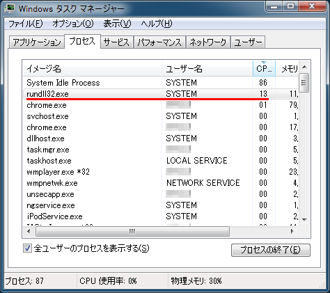 また、PCのファンがアイドル時に頑張りだした。タスクマネージャーで見てみたら、rundll32.exe というのが13食ってる。CPU温度が上がり、電力も消費してもったいない。