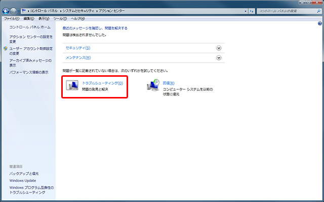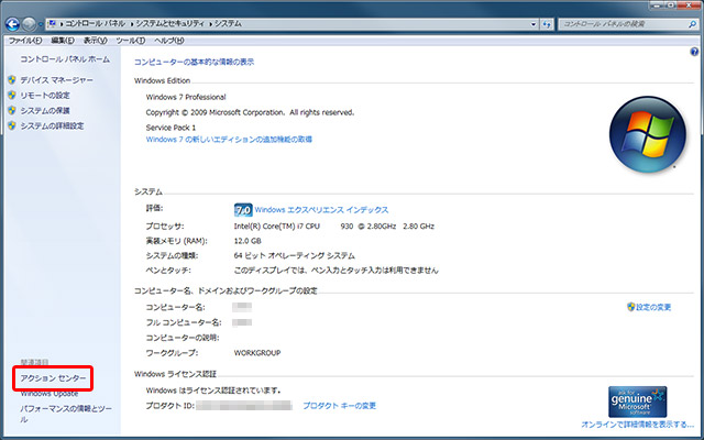 コントロールパネル → システムとセキュリティ → システム を開き、アクションセンターを開く。