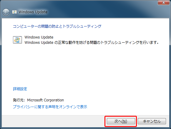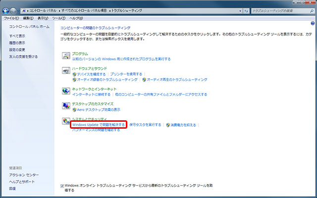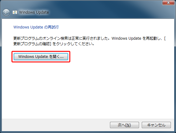 Windows Updateの問題が訂正される。Windows Update を開く… を押す。