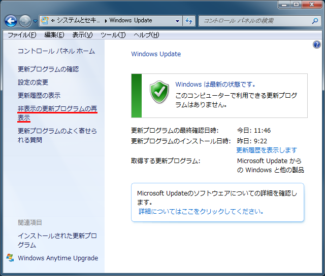 コントロールパネル → システムとセキュリティ → Windows Update を選択し、非表示の更新プログラムの再表示 をクリックする。