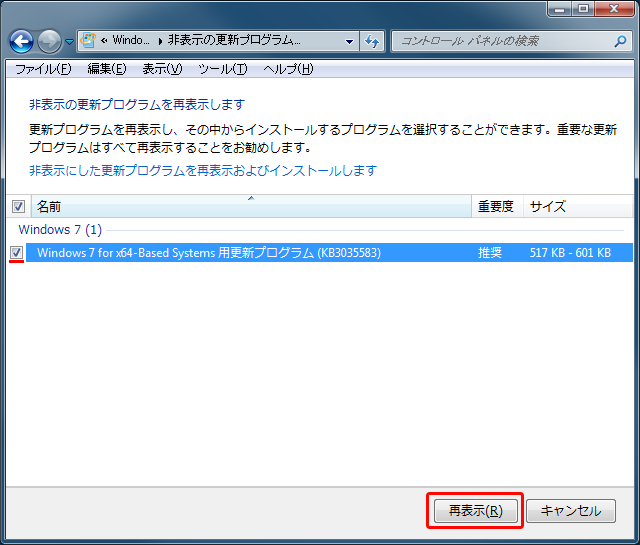 更新プログラム KB3035583 にチェックを入れ、再表示 を押す。