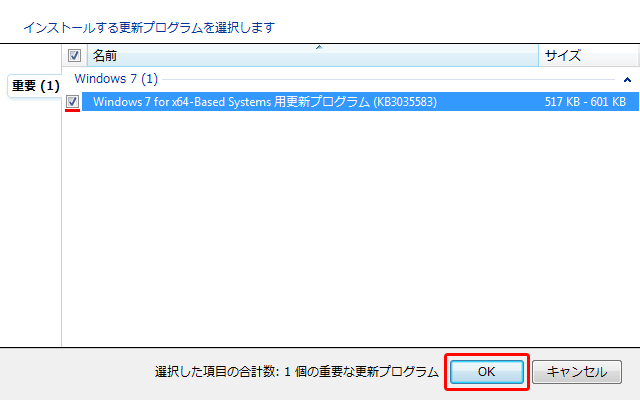 更新プログラム KB3035583 にチェックが入っているのを確認し、OK を押す。