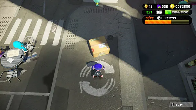 シリアルコードを入力し、スプラトゥーン2を起動してヒメとイイダのハイカラニュースが終わって、プレイヤーが出現したら、目の前に段ボール箱が置いてある。