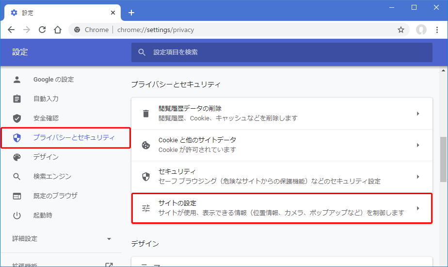 [プライバシーとセキュリティ] から [サイトの設定] を選択する。