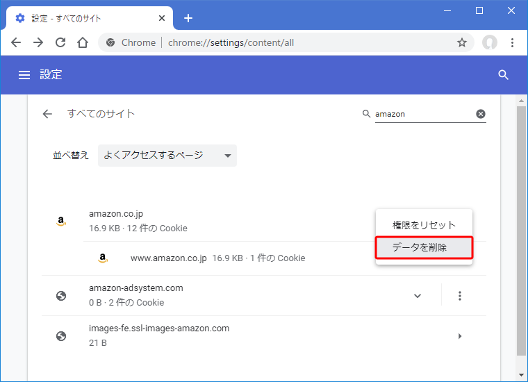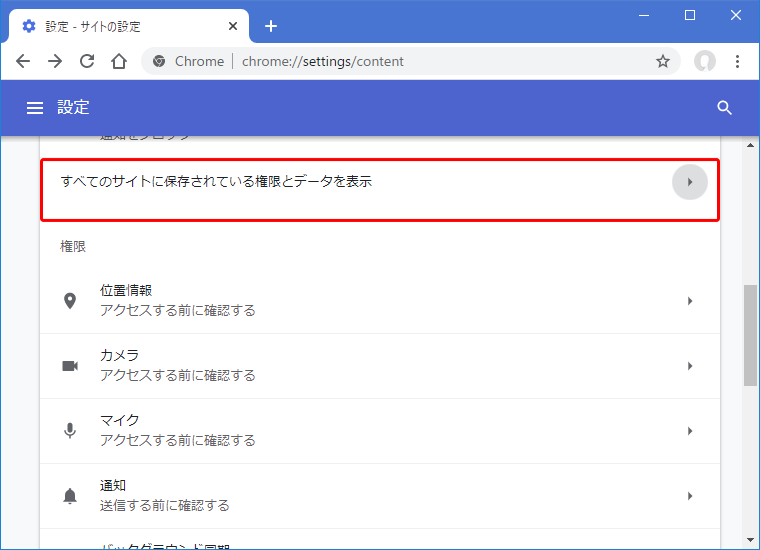 [すべてのサイトに保存されている権限とデータを表示] を選択する。