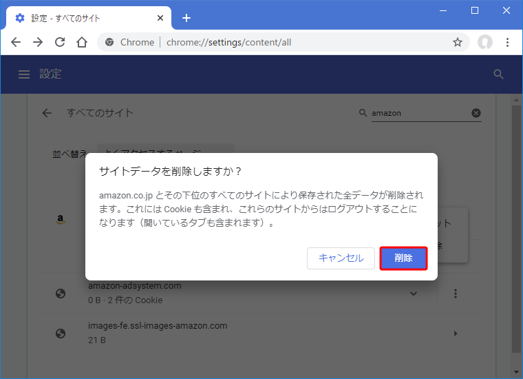 ダイアログ [サイトデータを削除しますか?] の [削除] をクリックする。