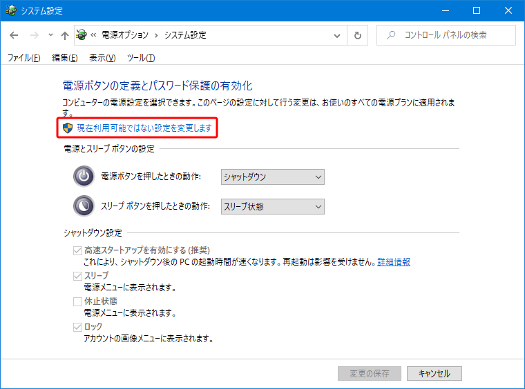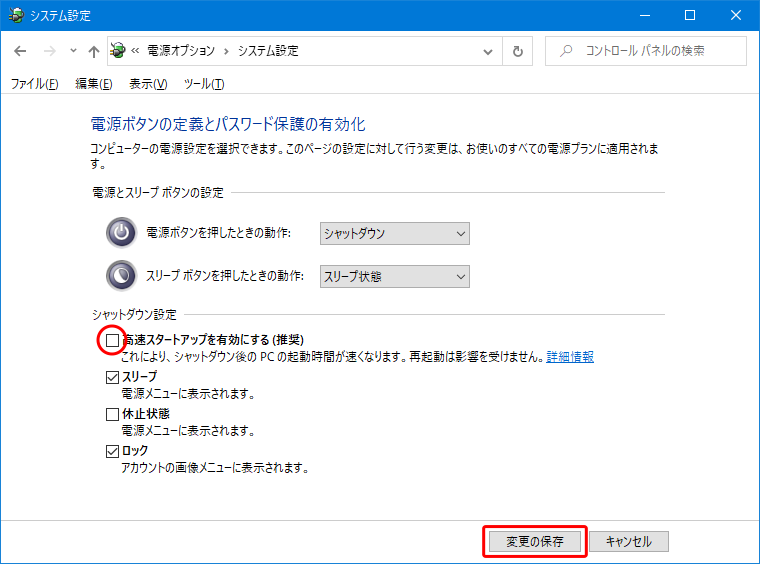 「高速スタートアップを有効にする(推奨)」のチェックを外し「変更の保存」を押す